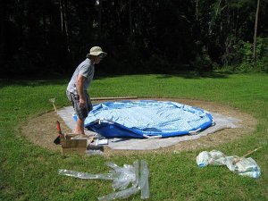 Step 5: Lay the pool on top of the plastic/sand combination and according to the instructions, let it sit in the sun. No worries, because you are doing this in the heat of the day, it will only take about 30 seconds for the pool to get almost too hot to touch.