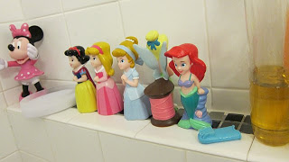 I was just searching the internet for a picture of Tinkerbell with a big cross or X through her. You know, to further illustrate for you my dislike. And let me tell you, I have found my people!!! Apparently there is a whole anti-Tinkerbell movement. Well maybe that’s a slight exaggeration. But still. There is a facebook page that you could ‘like’ with a description that says some thing like ‘why the obsession with Tinkerbell when she’s not even a real princess?!’ Exactly!!! I personally think that she is a dirty whore. What? You think this is a family blog?! I talk about boobs here, I think I can use the words dirty whore. Especially when they’re true. Seriously, is that the kind of role model you want for your kid?! She steals Minnie’s thunder (with all the merchandise they sell with her on it), she hardly has any clothes on and she totally tries to sabotage Peter and Wendy’s relationship. Well…maybe not, but still. I’m still not clapping my hands for that bitch! And you can make fun of me for feeling so strongly about a fictional Disney character but I don’t really care. One website even cautioned against getting a Tinkerbell tattoo because it’s associated with drug use. See, these are the type of people who like Tinkerbell…druggies! By the way, I love Peter Pan, it’s one of my favorite Disney movies. I think he was the first red head I’ve ever loved. Haha. But anyways, it’s just that nasty Tinkerbell who I don’t like. Hayley told me she was going to save the 3-4 year old ballet Tinkerbell song she has for when Alexa is in her class. I told her that I’d take her out and bring her to the other dance studio. She laughed and thought I was kidding…not so much! Here’s a picture of Alexa’s princess bath toys with Tink facing the correct way…at the wall.