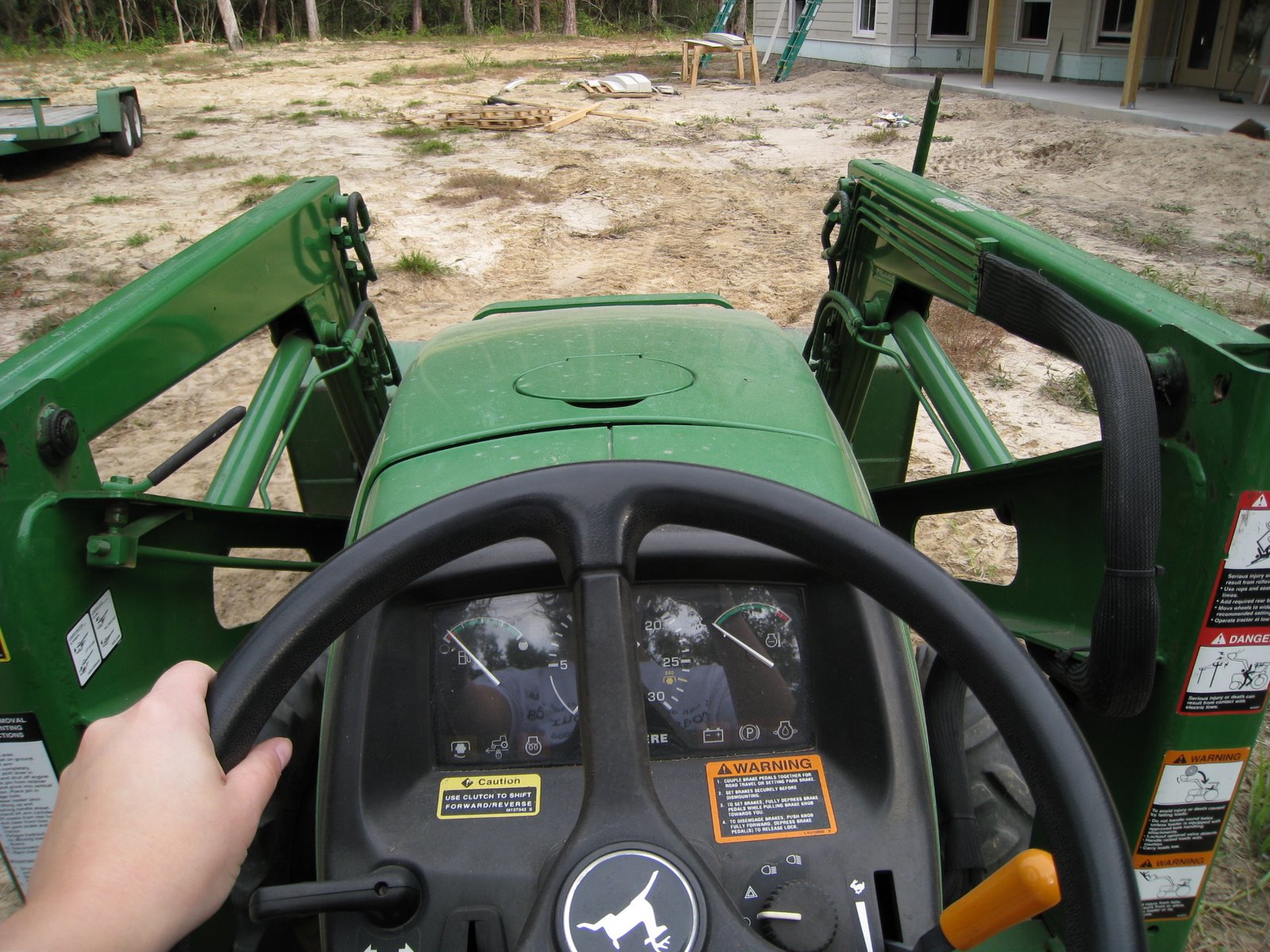 drove a tractor. Yeah, that’s right, completely not kidding. Today I drove a tractor. It’s not my tractor (obviously) it’s Randy, our project manager’s. He’s kind of like a contractor but not so intense. Anyway, he came by the house yesterday to drop off his tractor for us to use to clean up and get ready for the stone to be put up. The dumpster we have is for building materials only (it get’s recycled) so there’s random trash all over the place, it’s pretty gross. The idea is that instead of picking up each individual piece of trash and walking it over to the trash pile to be burned, you just fill up the front of the tractor and then drive it all to the pile at once and dump it. Because of Nick’s back he hasn’t been at the house (how convenient) so Randy gave the key to me. He asked if I had ever driven a tractor before and I told him that I had driven a fork lift. He chose to ignore my comment (I don’t know if he thought I was being sarcastic, or if he just ignored me) and he said to tell Nick that it was here for us to use if we wanted. Well this man clearly underestimates me (hehe) because today I drove his tractor, ha. Well, Nick had to tell me how first. It’s would be self explanatory if anything was labeled, but I had to make sure so I wouldn’t mess anything up. It’s pretty much like driving a fork lift except it has a clutch and the fork lift goes faster. Anyway, I was there by myself because Nick was on his bedrest and there was no one to take a picture of me so here is a picture of the tractor and me driving it from my point of view. If you ever need